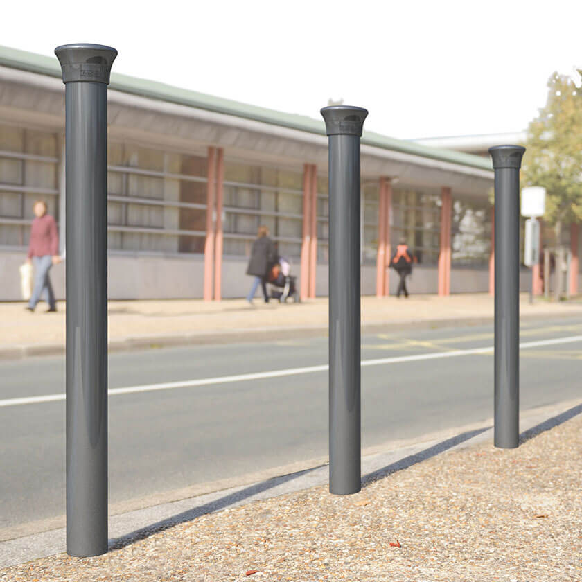 Stylish fixed steel street bollard designed with the distinctive Forum crown for modern-day pedestrian demarcation applications that require a static bollard with a subtle, elegant appearance.