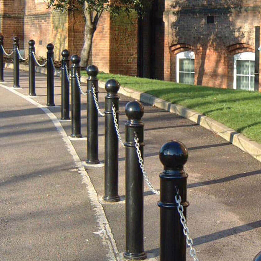Stylish mild steel fixed bollard designed as a replacement for a cast iron bollard with impact-resistant cast iron rings, and a decorative crown welded onto the bollard to complete the design.